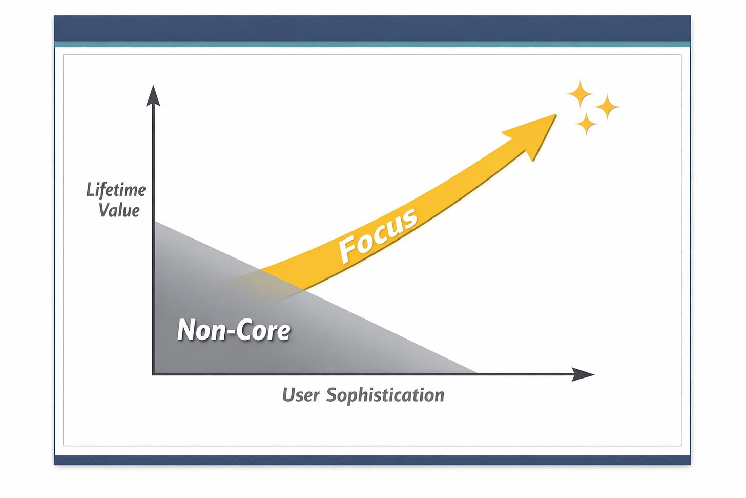 The lower-left quadrant — where our original users lived — was grayed out and labeled “Non-Core2.”
